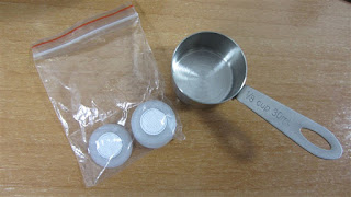 En la caja encontramos el envase, un cazo medidor y 4 filtros de co2 + 1 puesto ya en el envase.
