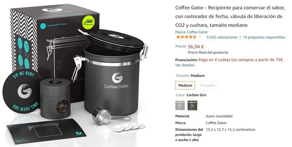 Continuamos con un nuevo producto disponible en Amazon, en esta ocasión revisamos un envase para guardar el café fabricado en acero inoxidable y con tapa de PVC con cierre hermético para garantizar el aroma del café