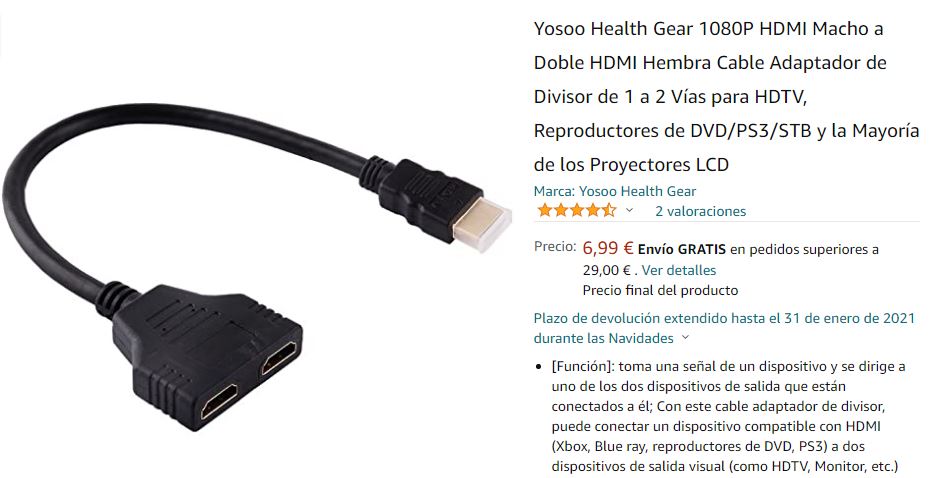 El siguiente producto puede ser interesante para quien quiera tener la señal de un dispositivo (Consola,Mediacenter, etc) y poder visualizarlo al mismo tiempo en dos fuentes, (TV, PROYECTOR, GRABADOR HDMI), de forma que de una señal multimedia tendremos dos.