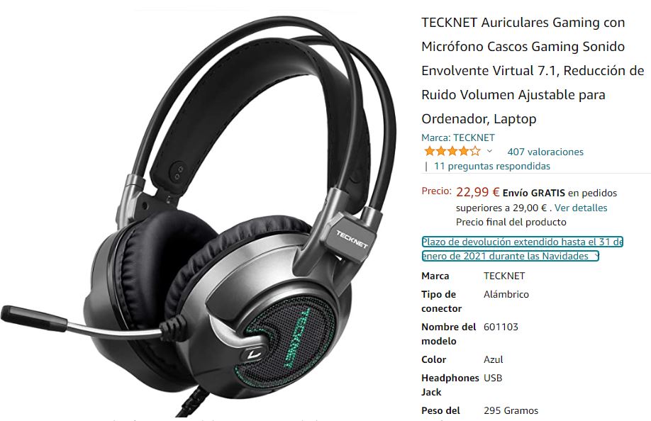 Como alternativa encontramos diversos auriculares con conector usb y pensados para jugar, los siguientes de la compañía Tecknet son bastante interesantes, están disponibles por 22,99€