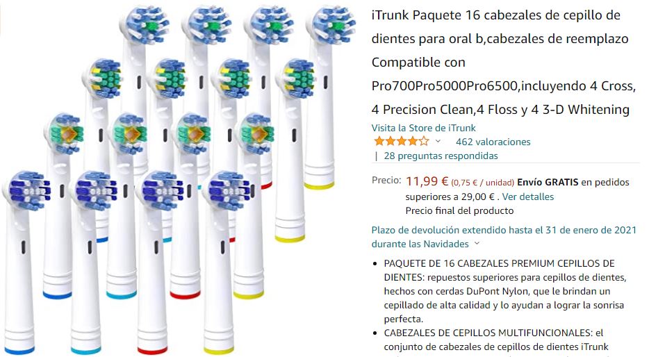 Continuamos con un nuevo análisis de otro producto disponible en Amazon, si tenéis alguna cepillo eléctrico Oral-b podéis conseguir distintos recambios compatibles de mayor o menor calidad, a continuación os muestro unos recambios que podréis conseguir por menos de 90 céntimos cada uno.