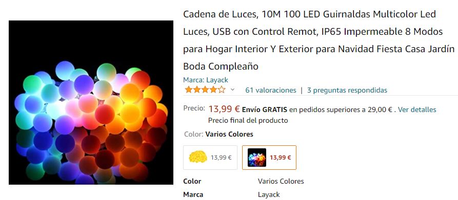 Se trata de una cadena de 100 leds repartidos en una tira de 10 metros valida para adornar tanto arboles de navidad como otras zonas de las casa en interiores.