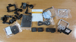 Viene con 2 baterías, la carcasa submarina, un recambio para la parte trasera y todo tipo de acoples para colocarla en distintos sitios, viene un manual de usuario en ingles.