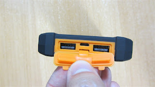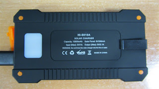 En la parte trasera vemos toda la información referente a la capacidad, y voltaje de los puertos, tiene una capacidad de 10.000 mAh y los dos puertos usb proporcionan 5V – 2.1A, el puerto microUSB admite una carga de 5V – 1A, el panel solar proporcionara 5V – 300 mA.