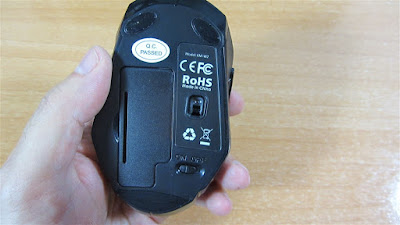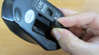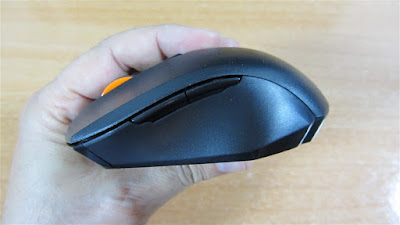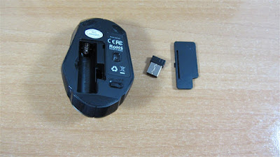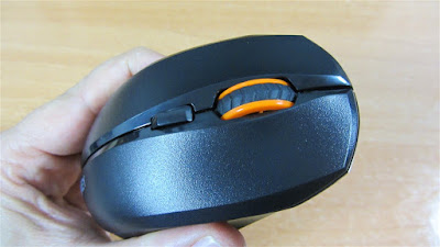 El ratón tiene un color negro con la rueda en color naranja, al quitar la tapa comprobamos que funciona con una pila AA no incluida, justo al lado de la pila esta el receptor usb que tendremos que sacar y conectar al pc para que se sincronice de forma automática.