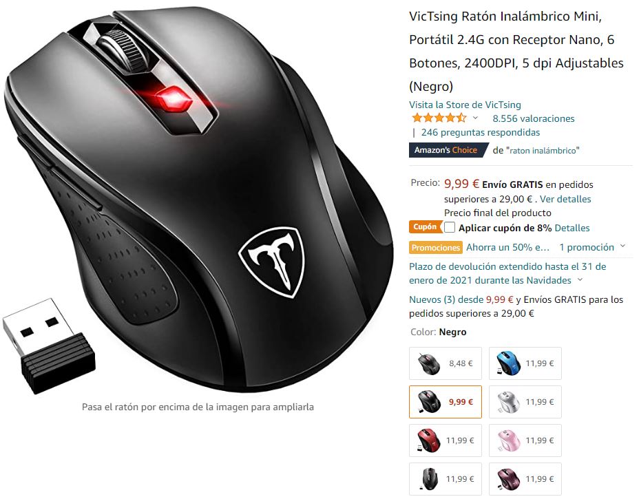 Como alternativa tenemos una gran variedad de ratones inalambricos, entre ellos tenemos este modelo de VicTsing bastante economico y disponible en varios colores desde 9,99€