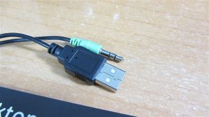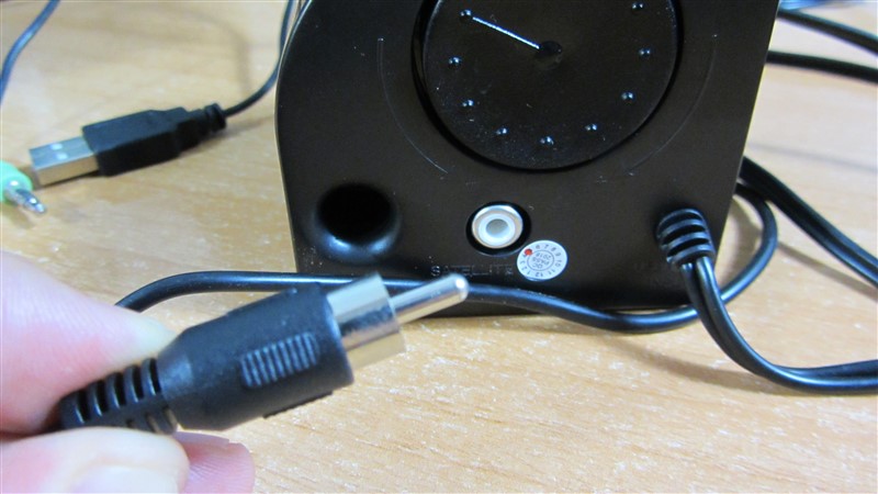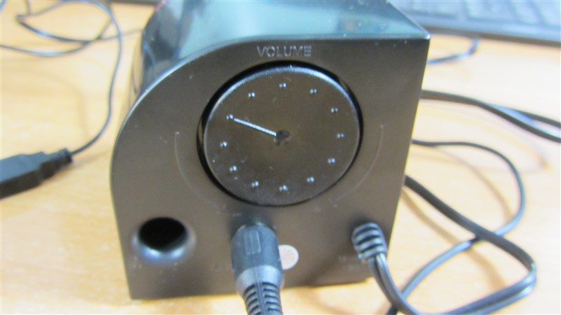 Uno de los altavoces tenemos el cable de audio con conector de 3.5 mm y el cable usb para alimentarlos, en la parte trasera tenemos una rueda para controlar el volumen de forma que podremos aumentar o disminuir el volumen desde el propio altavoz.