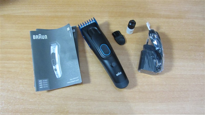 En la caja encontramos el cortapelos, un cepillo para limpiarlo, un bote de aceite, el cargador con enchufe europeo y el manual de instrucciones.