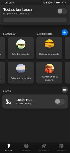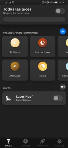 Una vez añadida la aplicación procederemos a buscar la lámpara, la detectará rapidamente y podremos añadirla, tras esto ya podemos controlar desde nuestro movil, encenderl, apagarla o cambiar el tono de luz y aumentar o disminuir la cantidad de luz.