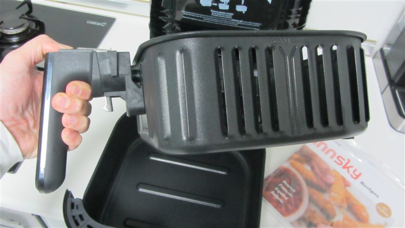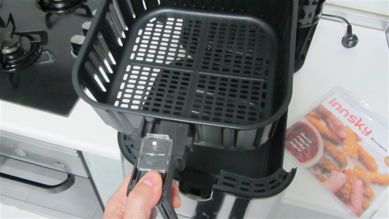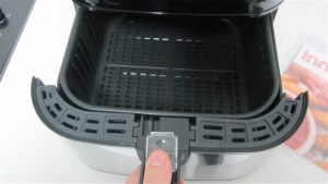 Además dispone de un botón negro para poder sacar la cesta de rejilla para poder servir la comida de forma mas cómoda y también para poder limpiar ambos recipientes.