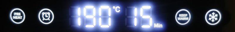 En la parte superior encontramos de izquierda a derecha, el botón de precalentamiento, botón de temporizador, display numérico en la parte central, botón de mantener caliente y por ultimo el botón para descongelar.
