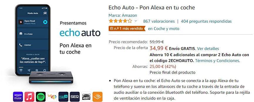 Otro Altavoz en Oferta es el modelo Echo Auto, el altavoz pensado para utilizar en el coche, con el podremos tener Alexa en nuestro coche, podremos oír música a través de los altavoces conectando con el cable auxiliar o mediante bluetooth.