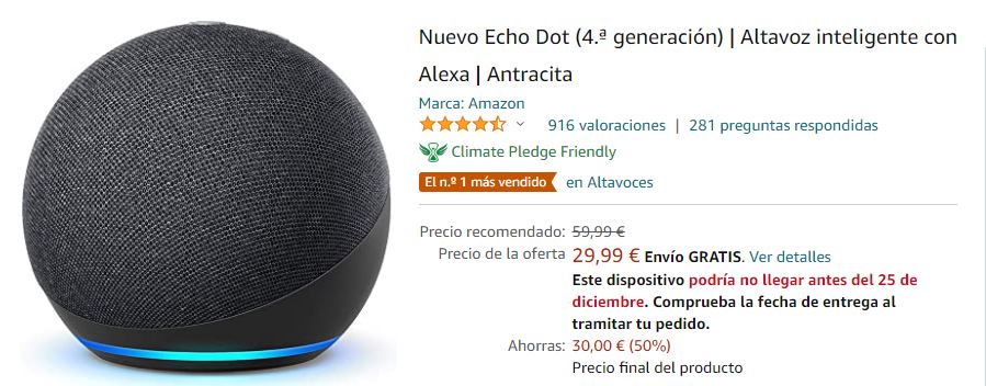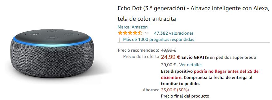 Esta disponible con una rebaja también del 50%, costando 24,99€, siendo una buena opción para adquirir un altavoz con Alexa a bajo precio.