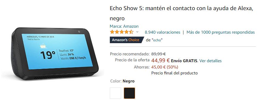 Una de los ofertas mas interesante es el Echo Show 5, un dispositivo con Alexa que incorpora una pantalla táctil de 5.5 pulgadas donde podremos ver videos, recetaos y mucho mas, también dispone de cámara integrada para poder realizar videoconferencias con dispositivos compatibles.