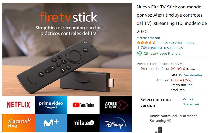También esta en oferta la versión normal de Fire TV Stick, a diferencia con la versión Lite este modelo dispone de control de TV desde el propio mando.