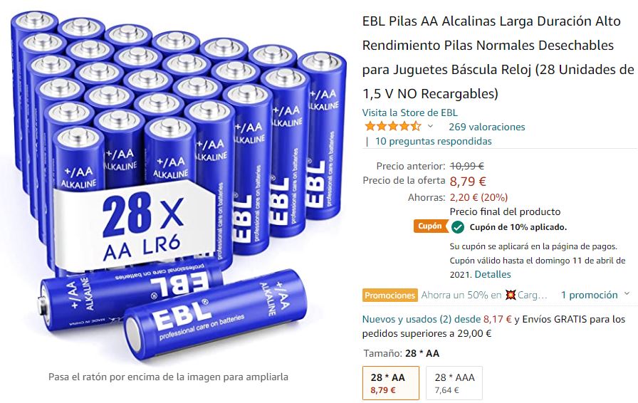 Podemos encontrarlas actualmente rebajadas un 20% en Amazon, por 8.79€ las AA y 7,64€ las AAA, también podremos conseguir un cargador para recargables en promoción al comprar algún producto de EBL.