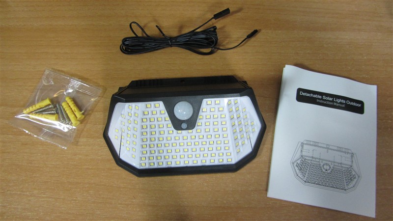 En la caja encontramos la lampara solar, unos tornillos y tacos para colgarla, un cable alargador para poder situar el panel solar directo al sol y un manual de instrucciones.