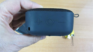 El altavoz tiene 5W de potencia, en la parte superior tiene 3 botones, el central nos permite encenderlo y apagarlo y poder pausar o reanudar la musica y contestar llamadas, los otros dos para subir/bajar volumen o cambiar de canccion.